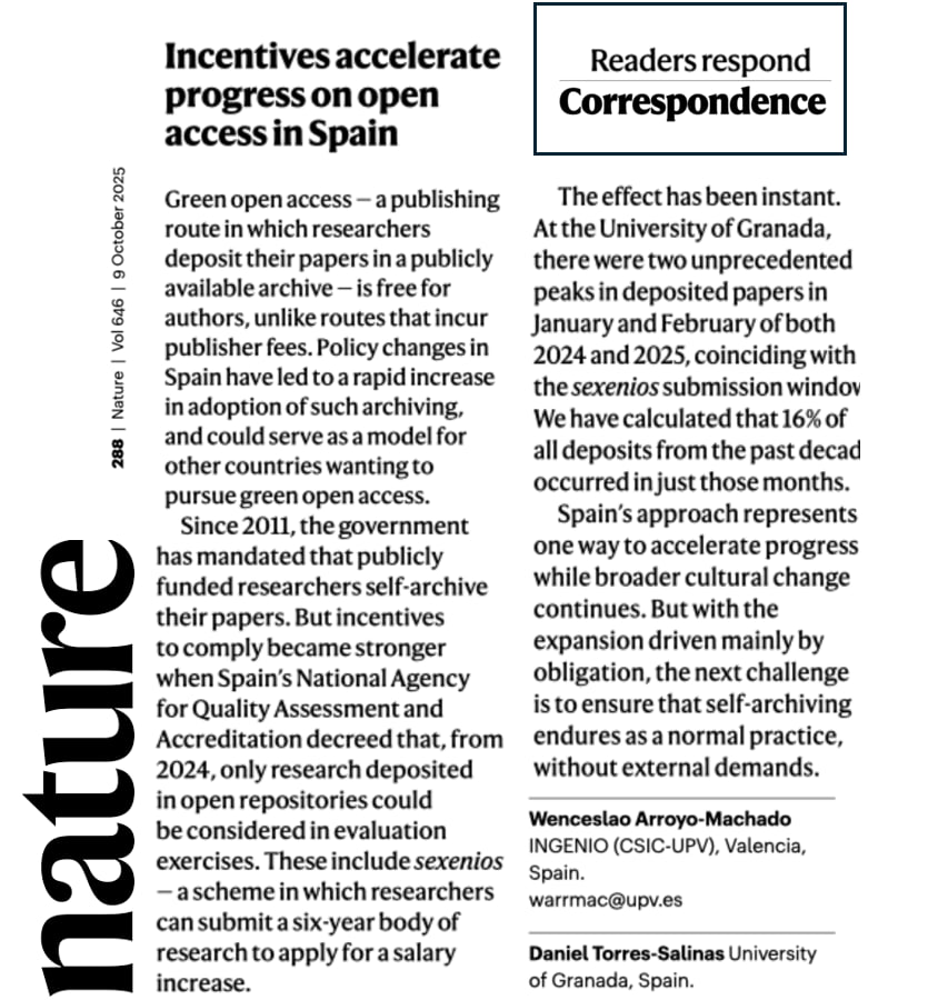 Researchers Wenceslao Arroyo-Machado (INGENIO, CSIC-UPV) and Daniel Torres-Salinas (University of Granada) have published a correspondence piece in Nature titled “Incentives accelerate progress on open access in Spain.” In it, they analyze the impact of national research evaluation policies and their relationship with the growth of open-access publishing.